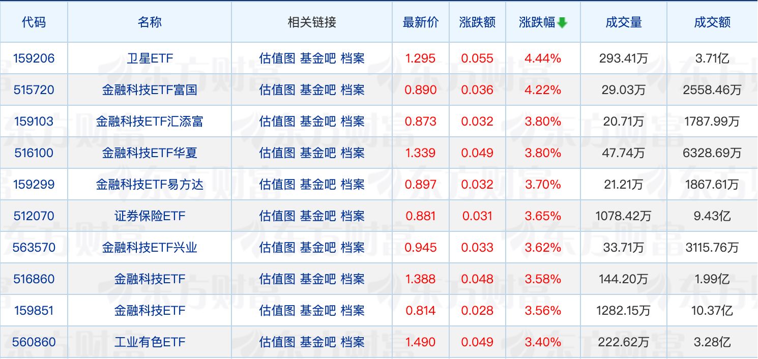 具体来看,卫星ETF领涨4.44%,金融科技ETF集体走强。