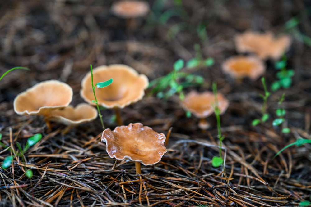 这是在内蒙古通辽市科尔沁左翼后旗的科尔沁沙地“双百万亩”综合治理工程努古斯台项目区内,樟子松林下生长的蘑菇(2024年8月3日摄)。新华社记者连振摄