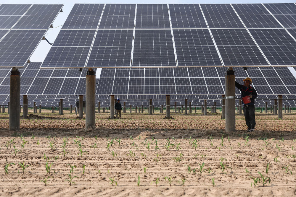 2025年5月29日,工作人员在辽宁彰武县章古台镇光伏+治沙生态产业项目现场对光伏板进行维护。新华社记者潘昱龙摄