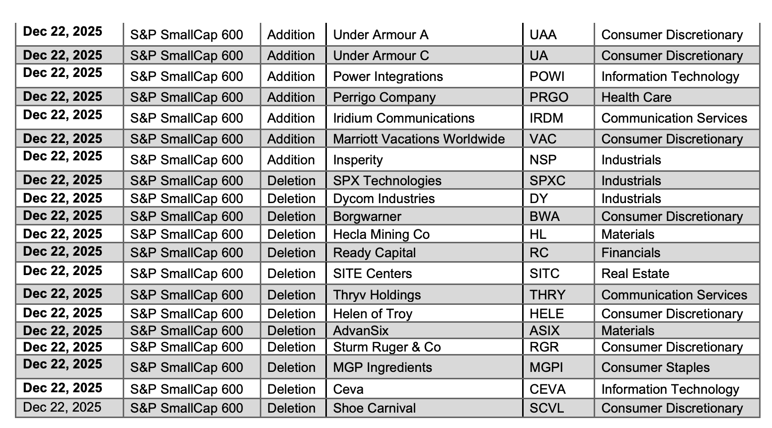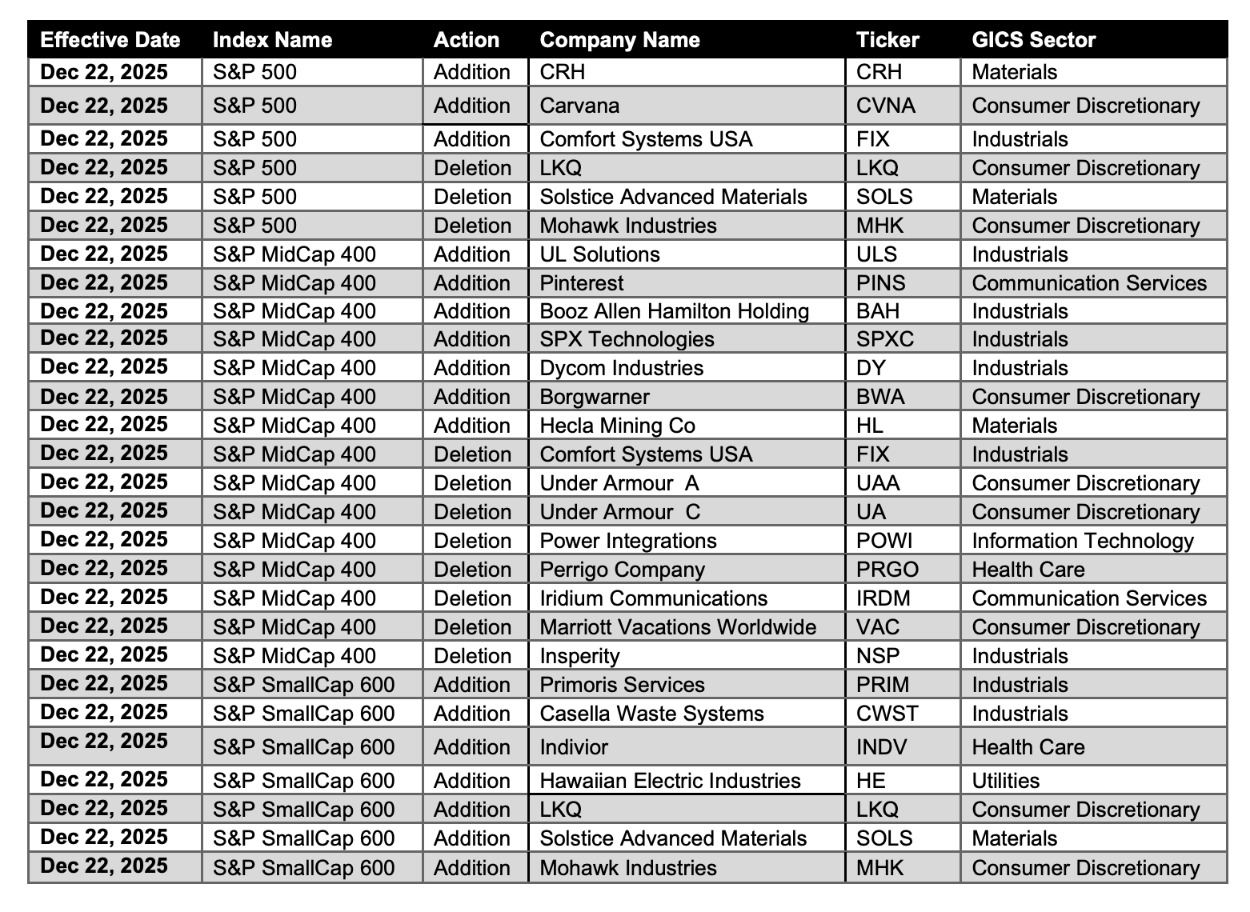 标普道琼斯指数公司当地时间12月5日宣布,将于12月22日(周一)开盘前对标普500指数、标普中盘400指数及标普小盘600指数实施以下调整,以配合季度再平衡操作。本次调整旨在确保各指数更能代表其对应的市值区间。被移出标普小盘600指数的公司已不再具有代表性。