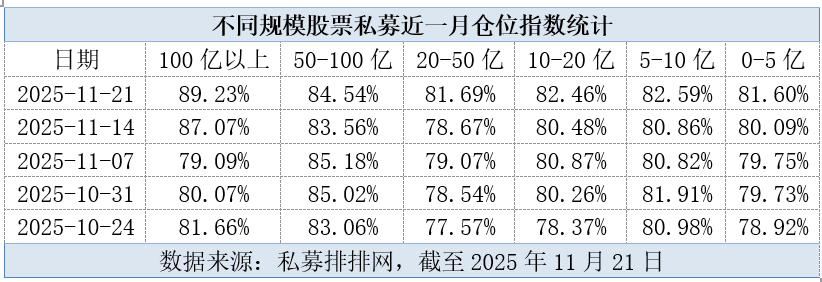 分策略来看,头部私募仓位更为积极。据统计,截至11月21日,百亿级私募平均仓位为89.23%,管理规模在50亿元-100亿元、20亿元-50亿元、10亿元-20亿元、5亿元-10亿元及0-5亿元区间的私募仓位分别为84.54%、81.69%、82.46%、82.59%和81.6%。