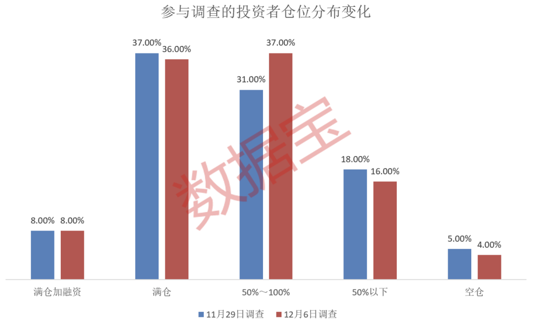 “50%~100%”的受访者所占比例环比大幅上升6个百分点,最新为37%;“满仓加融资”的占比不变,保持为8%。