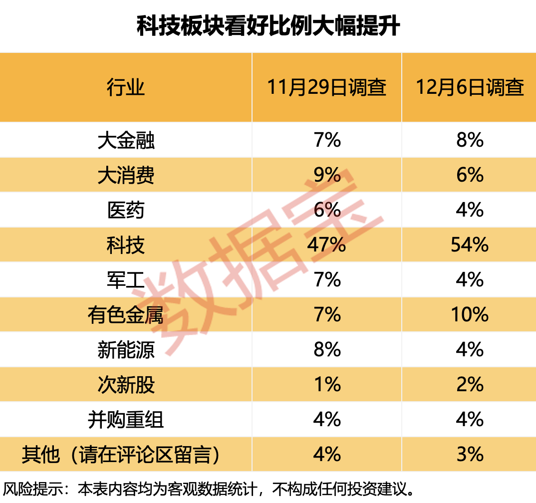 对于下周A股市场的潜力板块和方向选择,科技板块看好比例持续飙高,环比提升7个百分点,最新为54%,是受访者下周最为看好的板块。