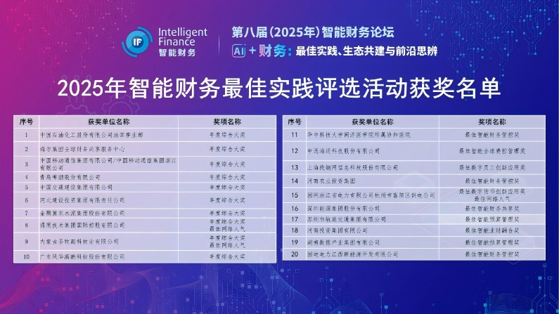 智能财务最佳实践年度综合大奖获奖单位和最佳实践名称分别为:中国石油化工股份有限公司油田事业部(基于人工智能的油气田企业经营质量指数评价方法)、海尔集团全球财务共享服务中心(海尔财务AI 创新实践应用)、中国移动通信集团有限公司/中国移动通信集团浙江有限公司(数治筑基,智用提效,AI创变——浙江移动财务数智化深度实践)、青岛啤酒股份有限公司(智慧财务的破局与实践——价值创造的升维之路)、中国交通建设集团有限公司(业财智联的AI创新实践——以中交集团合规履约、国际多语言翻译及财税知识生态智能财务建设为例)、河北建设投资集团有限责任公司(河北建投AI驱动下的业财税银一体化智能财务管理应用实践)、金隅冀东水泥集团股份有限公司(金隅冀东水泥业财融合驱动的全链路智能财务实践)、通用技术集团国际控股有限公司(乘 “数” 而上,“智” 领未来——通用技术国际公司构建一流数智财务管理体系建设实践)、内蒙古圣牧高科牧业有限公司(圣牧集团智能财务发展系统建设)、广东风华高新科技股份有限公司(智能财务赋能企业数字化转型——风华高科财务共享建设实践)。