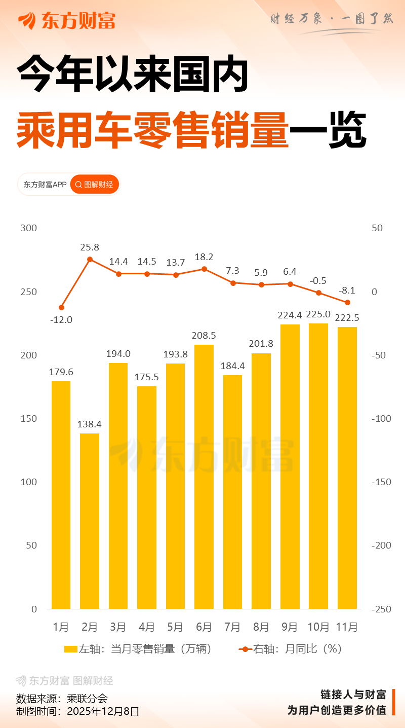 乘联分会数据显示,11月全国乘用车市场零售222.5万辆,同比下降8.1%,环比下降1.1%。今年以来累计零售2,148.3万辆,同比增长6.1%。今年国内车市零售累计增速从1-2月增长1.2%,3-6月增长15%,7-9月增速徘徊在6%左右,10-11月回落到偏低状态,呈现四季度高基数的减速特征,基本符合年初判断的“前低中高后平”的走势。