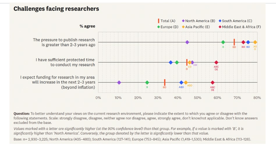 报告显示,只有45%的科研人员认为自己拥有足够的时间用于科研,且仅有33%预期未来两到三年内本领域科研经费会增加,其中北美和欧洲科研人员的悲观情绪尤为突出;此外,68%的受访者认为发表压力明显高于两三年前。尽管如此,科研人员依然坚定维护科研质量与科研诚信,74%的受访者认为经过同行评审的科研值得信赖,并视同行评审为保障科研诚信、扩大影响力的重要机制。