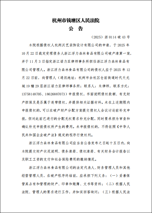 12月8日,浮力森林微信公众号发布一则破产公告称,杭州市钱塘区人民法院于2025年10月22日裁定浙江浮力森林食品有限公司破产清算一案,浙江浮力森林食品有限公司的债权人应于2025年12月22日前,向管理人申报债权,书面说明债权数额,有无财产担保及是否属于连带债权,并提供相关证据材料。