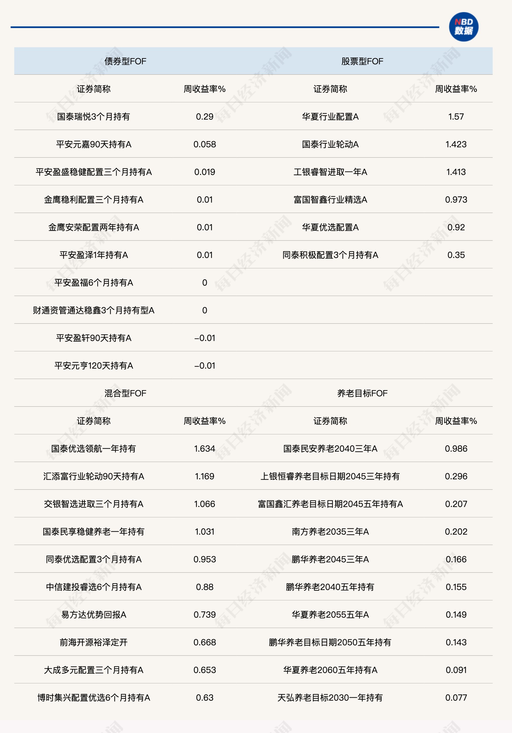 受此带动,权益类FOF的业绩修复明显。Wind统计显示,上周,股票型FOF全部实现正收益,华夏行业配置A录得1.57%涨幅;混合型FOF当中,国泰优选领航一年持有的单周业绩达到1.63%,后者也是所有FOF中上周业绩最好的一只。