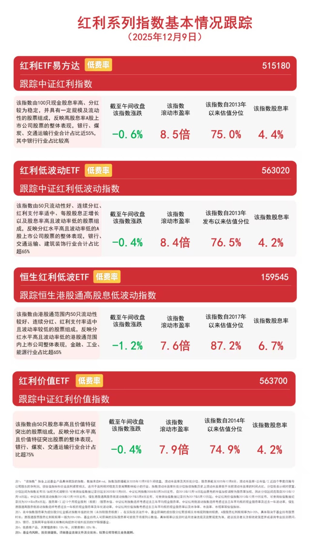据悉,易方达基金是目前唯一一家红利类ETF全部实行低费率的基金公司,恒生红利低波ETF(159545)、红利ETF易方达(515180)、红利低波动ETF(563020)、红利价值ETF(563700)、A500红利低波ETF(563510)等产品管理费率均为0.15%/年,可助力投资者低成本布局高股息资产。