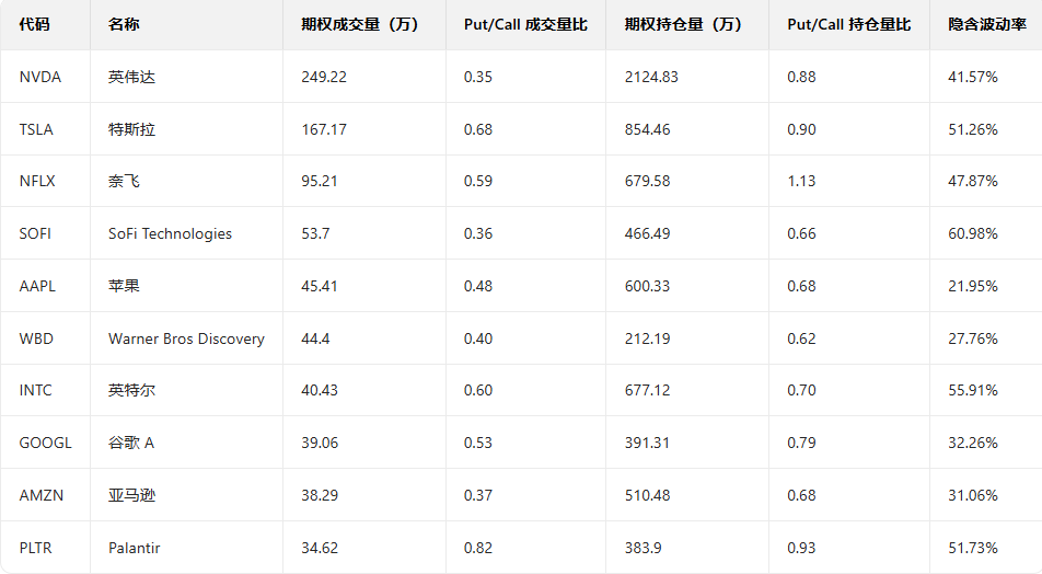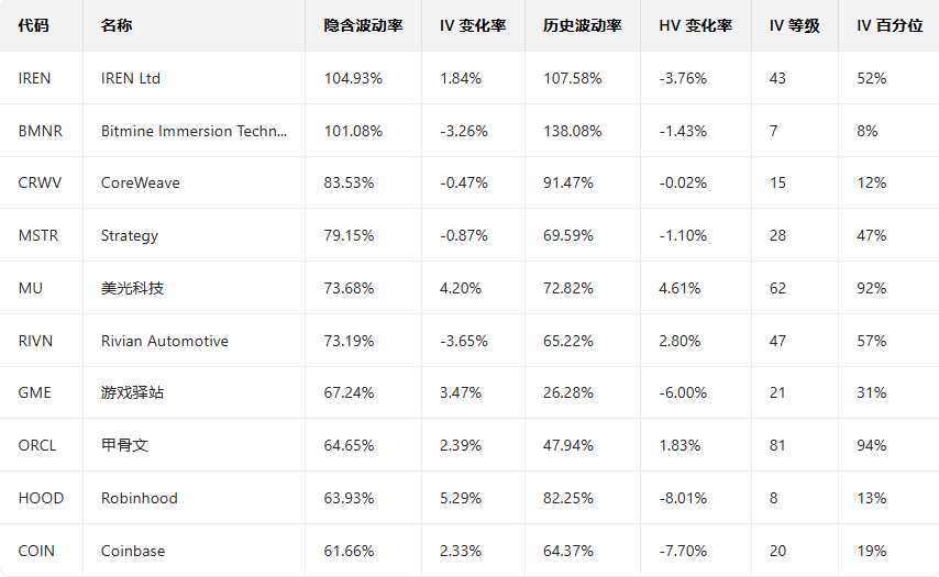 美股期权波动率排行榜前十(标的市值>100亿美元,且期权成交量>10万张)