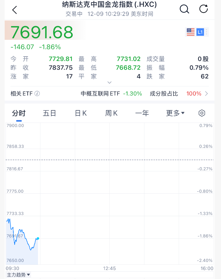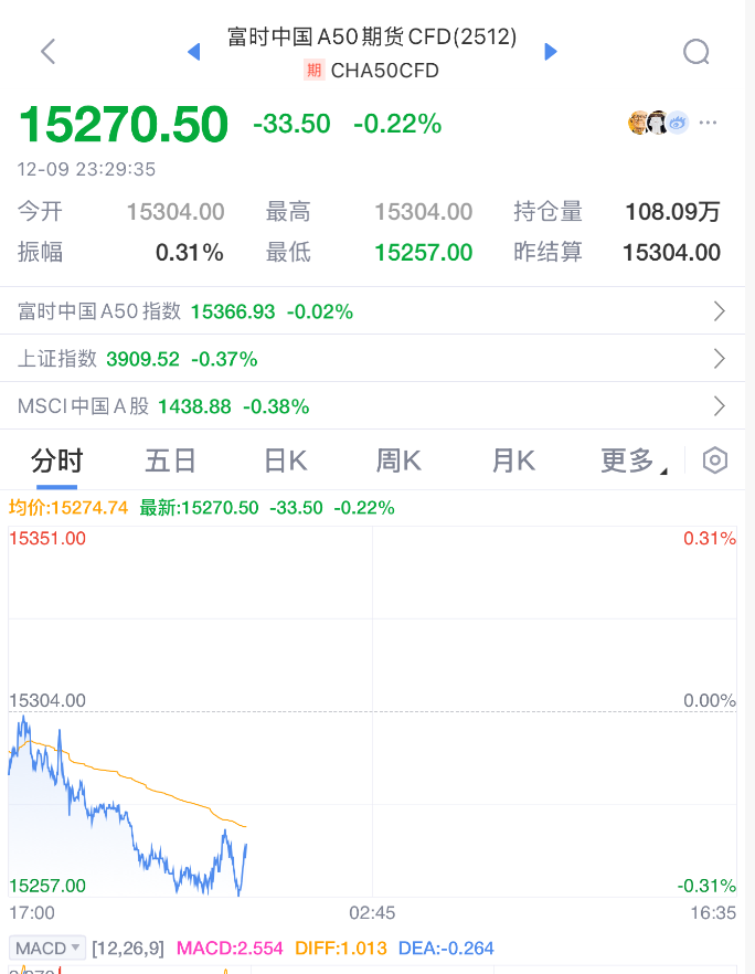 中国资产表现不佳,中概股指数跌近2%,富时中国A50期货指数小幅跳水。