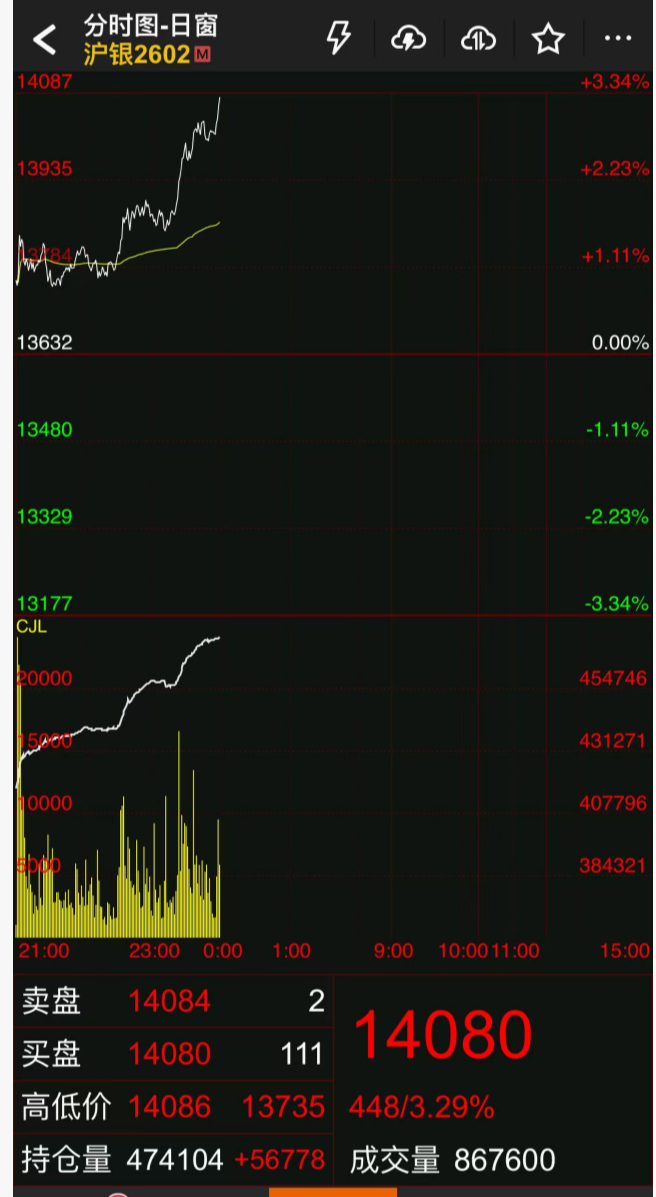 截至发稿,现货白银首次站上60美元/盎司的心理关口,纽约期银也首次站上60美元/盎司,沪银主力合约现涨幅超过3%,最高涨至14086元/千克,续创历史新高。