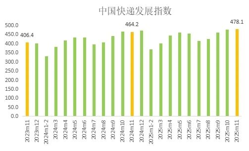 中新网12月9日电据国家邮政局微信公众号消息,经测算,2025年11月中国快递发展指数为478.1,同比提升3%。其中发展规模指数、服务质量指数和发展能力指数分别为646、661.3和266.4,同比分别提升6%、1.9%和0.3%。发展趋势指数为60.3。11月,行业旺季特征明显,市场规模较快增长,服务质效稳步提升,运营效能持续增强,科技装备扩大应用。快递业的良好发展充分彰显我国经济活力,为服务民生、促进产业升级提供坚实支撑。