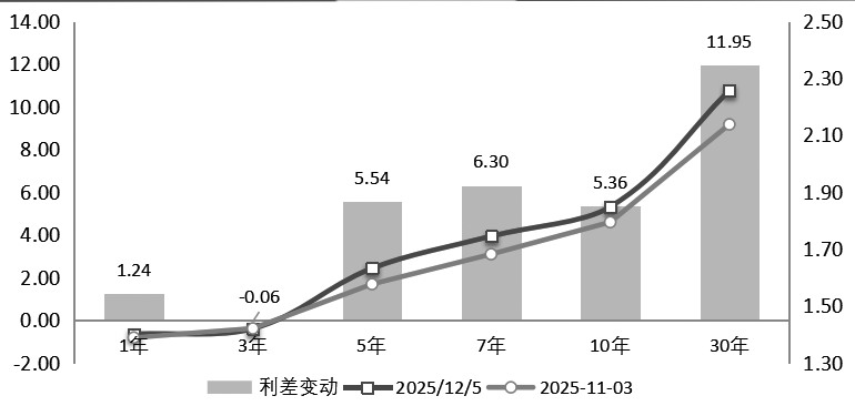 图为国债收益率曲线走陡,30年期和10年期国债利差持续走升(单位:%)