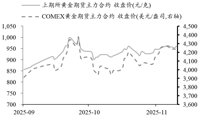 图为上期所、COMEX黄金主力合约走势