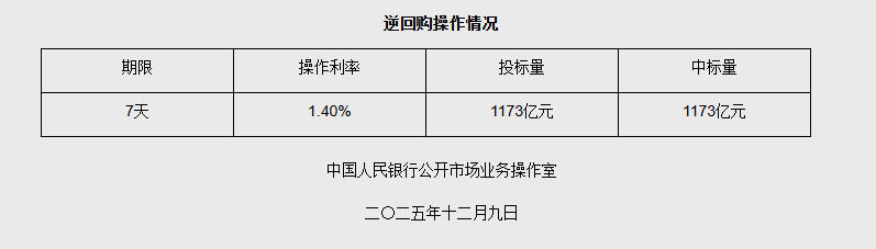 中新网12月9日电据央行网站消息,2025年12月9日中国人民银行以固定利率、数量招标方式开展了1173亿元7天期逆回购操作。具体情况如下: