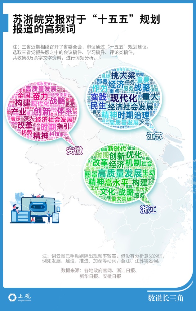 近期,江苏、浙江、安徽三省省委陆续召开全会,审议并通过了各自的“十五五”规划建议。三省均紧扣中央精神、紧扣重点工作、紧扣民生需求,锚定中国式现代化目标,立足自身禀赋,在战略重点、发展路径上呈现差异化特色的同时,瞄准科技创新、扩大内需、文化建设等方面发力,推进一体化发展。