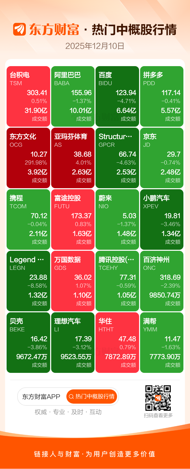 台积电涨0.51%,阿里巴巴跌1.37%,百度跌4.71%,拼多多跌0.41%,东方文化涨291.98%,亚玛芬体育涨4.01%,Structure Therapeutics Inc ADR跌4.63%,京东跌0.74%,携程跌0.04%,富途控股涨0.83%。