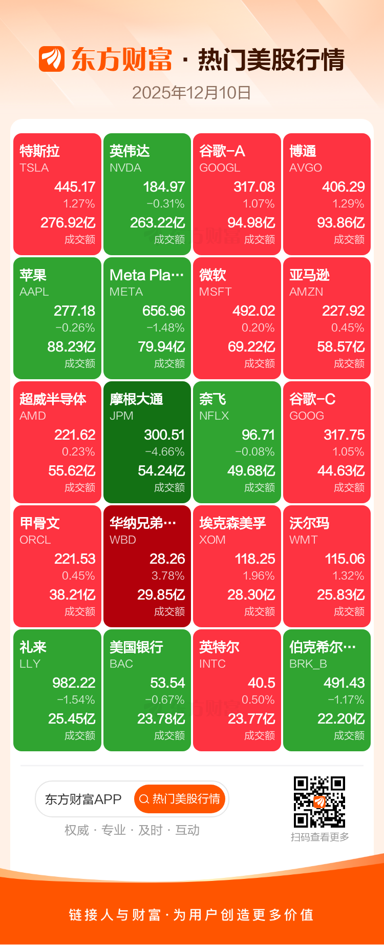 特斯拉涨1.27%,英伟达跌0.31%,谷歌-A涨1.07%,博通涨1.29%,苹果跌0.26%,Meta Platforms Inc-A跌1.48%,微软涨0.20%,亚马逊涨0.45%,超威半导体涨0.23%,摩根大通跌4.66%。