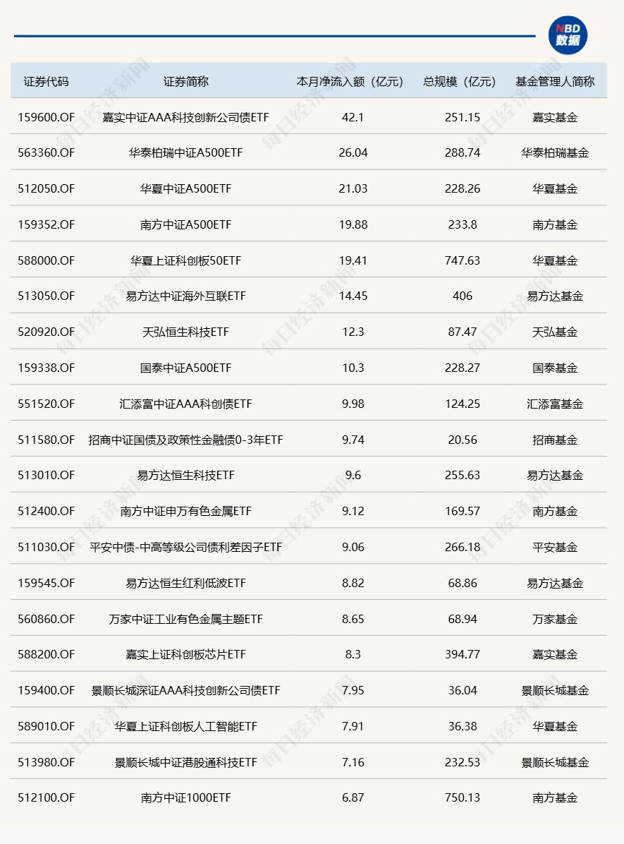 Wind数据显示,在12月9日的非货币ETF市场中,汇添富中证AAA科创债ETF份额增加0.08亿份,实现净流入7.98亿元;南方中证A500ETF增加4.65亿份,对应净流入5.66亿元;嘉实上证科创板芯片ETF份额增加2.34亿份,带来净流入5.42亿元。