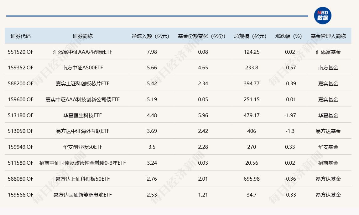ETF规模速报 | 科创债ETF汇添富昨日净流入近8亿元,沪深300ETF净流出逾15亿元