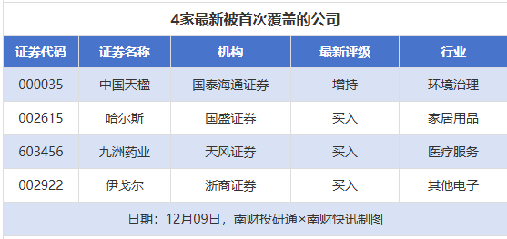 首次覆盖方面,12月9日券商共给出了4次首次覆盖。其中,中国天楹获得国泰海通证券给予“增持”评级,哈尔斯获得国盛证券给予“买入”评级,九洲药业获得天风证券给予“买入”评级,伊戈尔获得浙商证券给予“买入”评级。