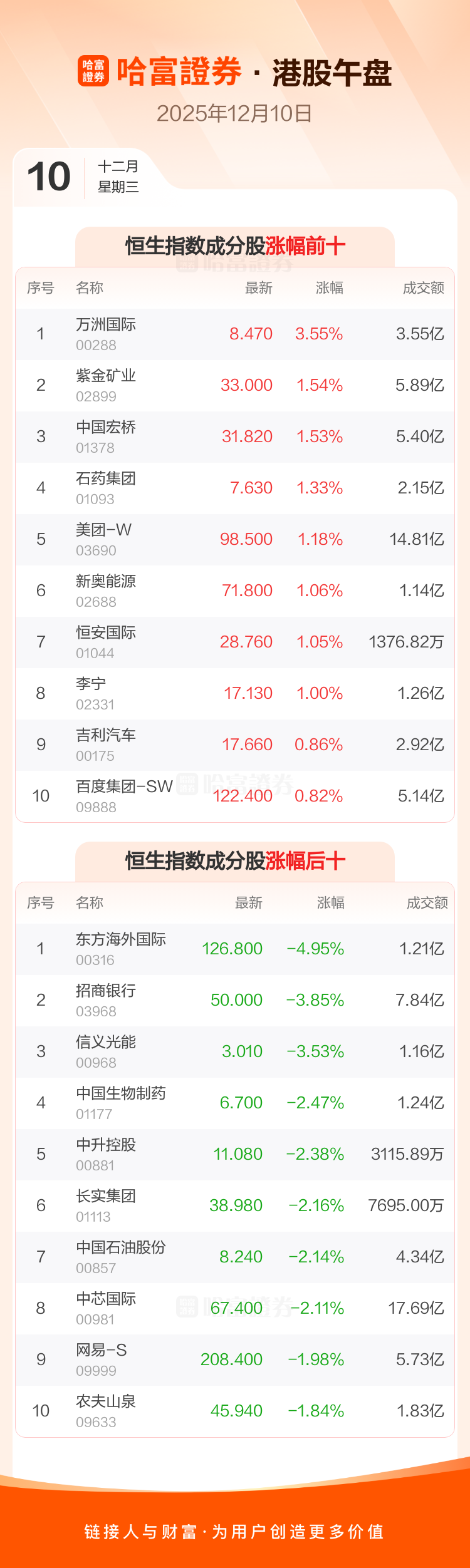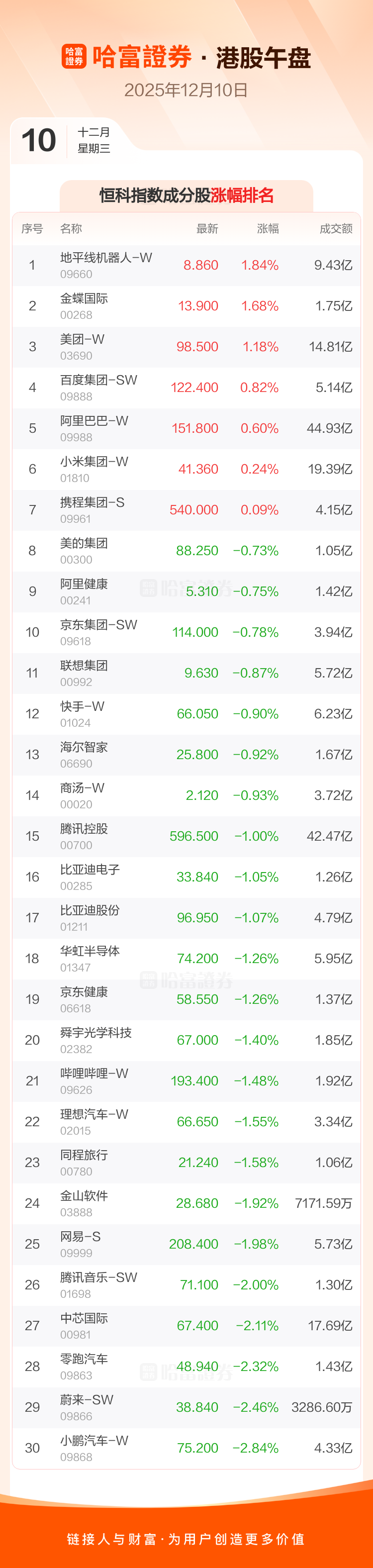 港股12月10日午盘走低 ,恒生指数收报25325.05点,跌109.18点,跌幅0.43%;恒生科技指数收报5516.99点,跌37.69点,跌幅0.68%。恒生指数成分股中万洲国际、紫金矿业、中国宏桥涨幅居前,东方海外国际、招商银行、信义光能跌幅靠前。恒生科技指数成分股中地平线机器人-W、金蝶国际、美团-W涨幅居前,小鹏汽车-W、蔚来-SW、零跑汽车跌幅靠前。