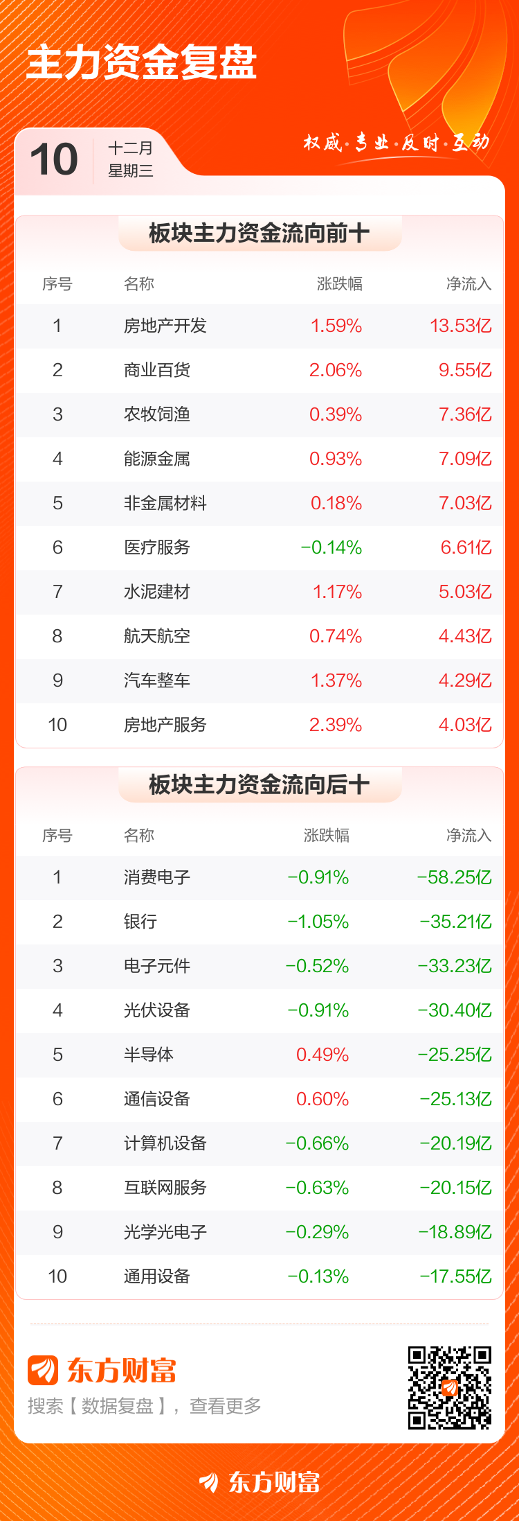 12月10日,沪指跌0.23%,深成指涨0.29%,创业板指跌0.02%。两市成交额1.78万亿,较上个交易日缩量1254亿。数据显示,今日大盘主力资金净流出335.68亿。房地产开发、商业百货、农牧饲渔等板块主力资金流入排名居前,其中房地产开发净流入13.53亿元。