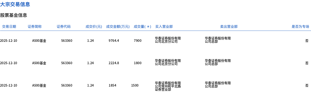 12月10日,A500基金大宗交易成交1.12亿股,成交额1.38亿元,占当日总成交额的1.64%,成交价1.24元,较市场收盘价1.236元溢价0.32%。