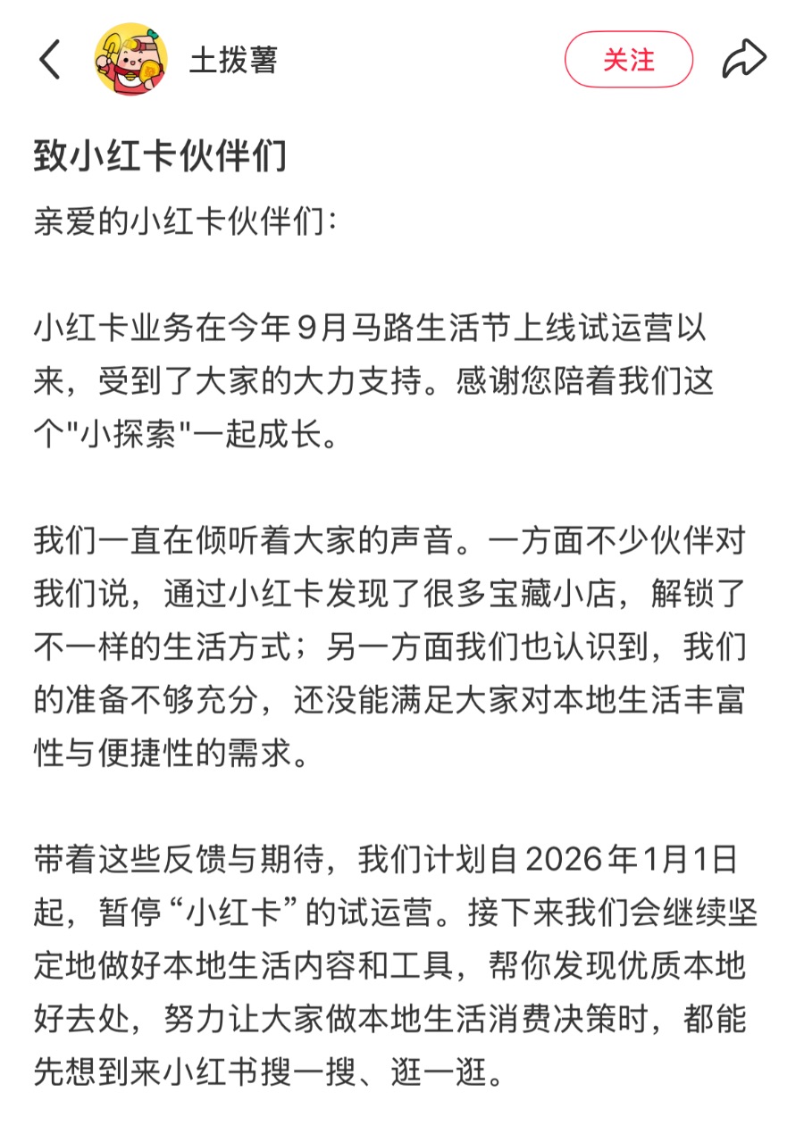官方表示,“小红卡”团队接下来将阶段性集中资源,聚焦在本地生活内容影响力,提升本地生活交易产品和工具。