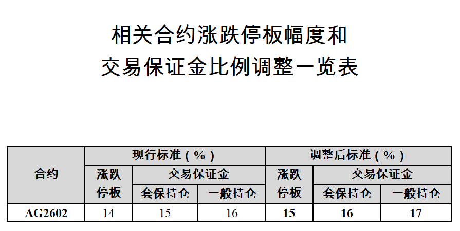 白银期货AG2602合约的涨跌停板幅度调整为15%,套保持仓交易保证金比例调整为16%,一般持仓交易保证金比例调整为17%。
