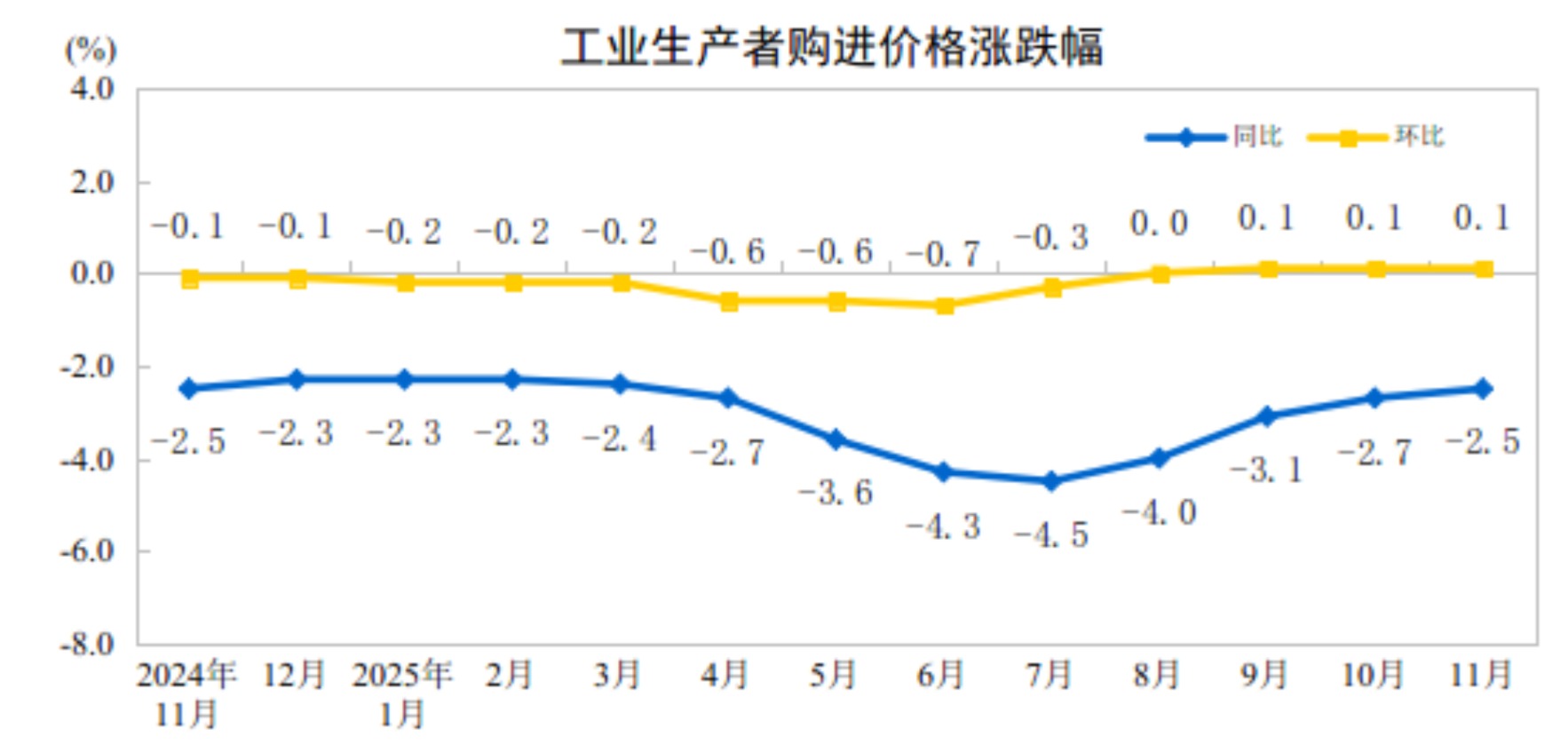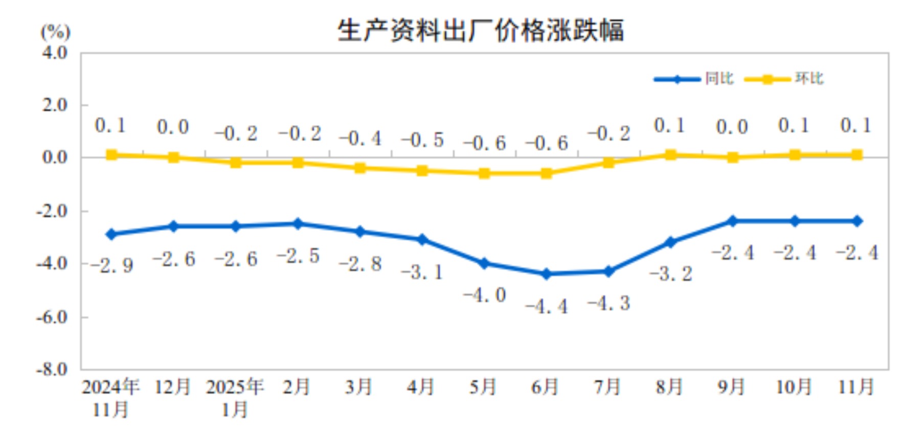 上证报中国证券网讯据国家统计局12月10日发布的数据显示,11月份,全国工业生产者出厂价格同比下降2.2%,工业生产者购进价格同比下降2.5%;工业生产者出厂价格和购进价格环比均上涨0.1%,涨幅均与上月相同。1—11月平均,工业生产者出厂价格比上年同期下降2.7%,工业生产者购进价格下降3.1%。