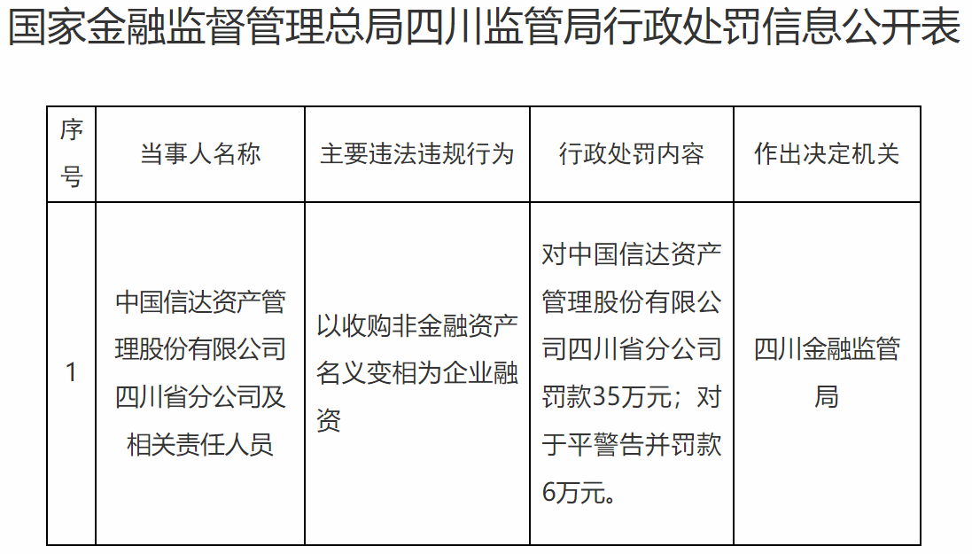 变相为企业融资,中国信达四川省分公司被罚35万元