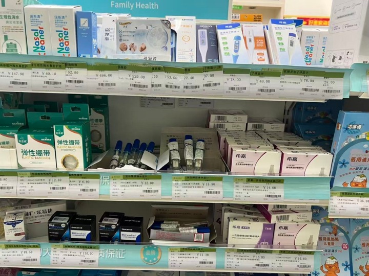 国大药房泰康路店只有两款含汞温度计在售,门店表示库存卖完就不进货了。陈玺撼摄