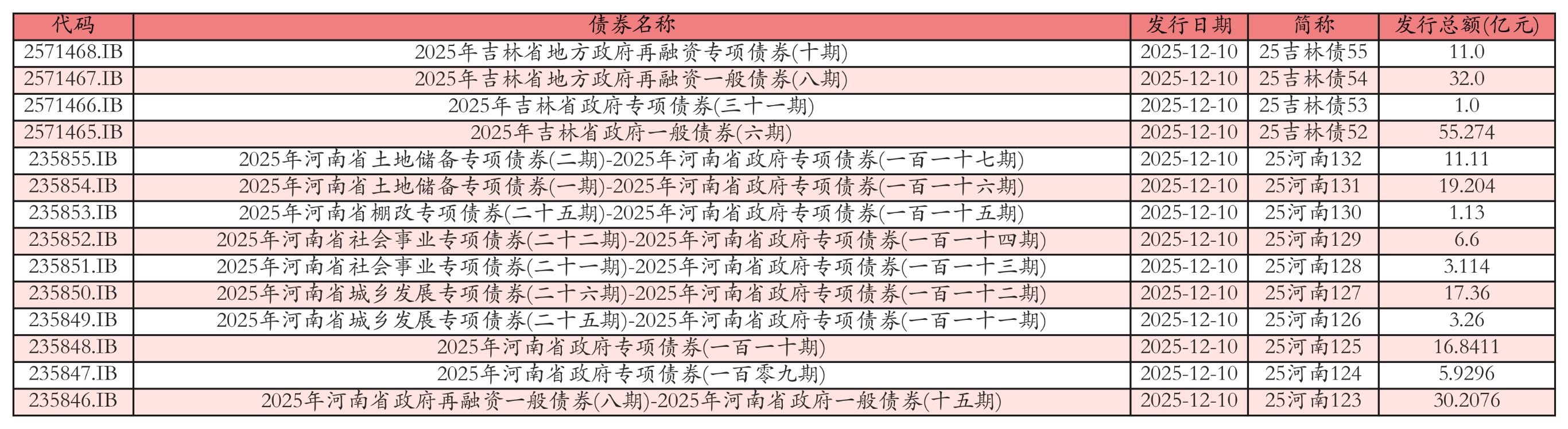 南财智讯12月10日电,南财金融终端数据显示,2025年12月10日全国共发行14只地方政府债,共计214.0303亿元。其中,政府一般专项债发行3只,共117.4816亿元;地方政府专项债发行11只,共96.5487亿元。各地方政府所发行债券中,25吉林债52、25河南123发行规模靠前,发行金额分别为55.274亿元、30.2076亿元。投标方面,各地方政府所发行债券中,25吉林债52、25河南123全场中标倍数靠前。其中:25吉林债52全场中标倍数为20.15,全场中标利率为1.9%,边际倍数为1.03;25河南123全场中标倍数为24.94,全场中标利率为2.05%,边际倍数为1.28。今日发行地方政府债详情如下表: