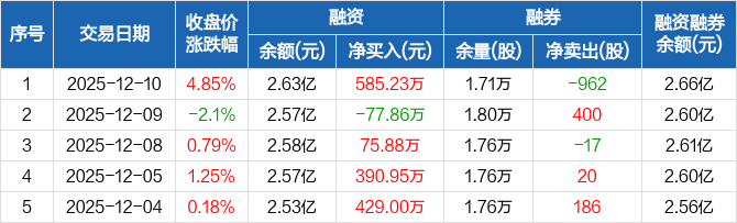 峰岹科技:融资净买入585.23万元,融资余额2.63亿元(12-10)