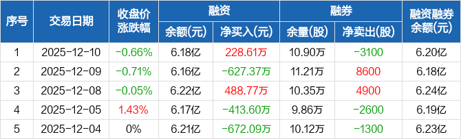 融资方面,当日融资买入2900.25万元,融资偿还2671.64万元,融资净买入228.61万元。融券方面,融券卖出100股,融券偿还3200股,融券余量10.9万股,融券余额198.16万元。融资融券余额合计6.2亿元。