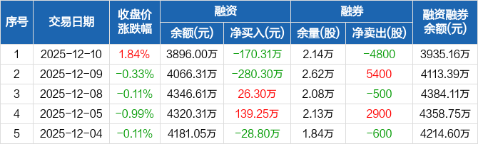 欧普照明:融资净偿还170.31万元,融资余额3896万元(12-10)