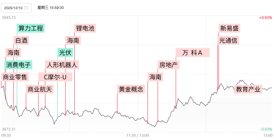 财联社12月11日电,上个交易日市场探底回升,三大指数涨跌不一,深成指、创业板指盘中先后翻红,创业板指此前一度跌超2%。全市场超2800只个股下跌。沪深两市成交额1.78万亿,较前日缩量1254亿。1)据报道,SpaceX拟IPO募资超300亿美元,目标整体估值约1.5万亿美元,并计划最快于2026年中后期上市,预计将利用部分IPO募资开发太空数据中心。商业航天概念受此提振再度活跃,龙洲股份、再升科技实现连板晋级,前日炸板的西部材料实现反包涨停,但板块内几只前期领涨的人气品种包括航天发展、航天机电、雷科防务等展开大幅回调。2)近期谷歌在AI方向的加速,其软硬件一体化的潜力备受市场关注,光通信产业链热度依旧,空芯光纤概念股特发信息、长飞光纤双双涨停,受益光隔离器、法拉第旋光片等上游供需持续吃紧,东田微、长光华芯、永鼎股份、新易盛、中际旭创等成分股大面积刷新历史高点。3)全国零售业创新发展大会于12月9日至10日举行,零售等消费股延续强势,东百集团、永辉超市、茂业商业、美凯龙实现连板晋级。但食品饮料、包装等分支多数个股冲高回落,早盘一度晋级4连板的昇兴股份以及一度冲高16%的欢乐家盘中震荡回落双双报收绿盘。4)12月以来,包括广州、南宁等地推出购房补贴政策,地产股午后大面积拉升,万科A时隔近10个月再度录得涨停,金地集团、保利发展双双涨逾5%。