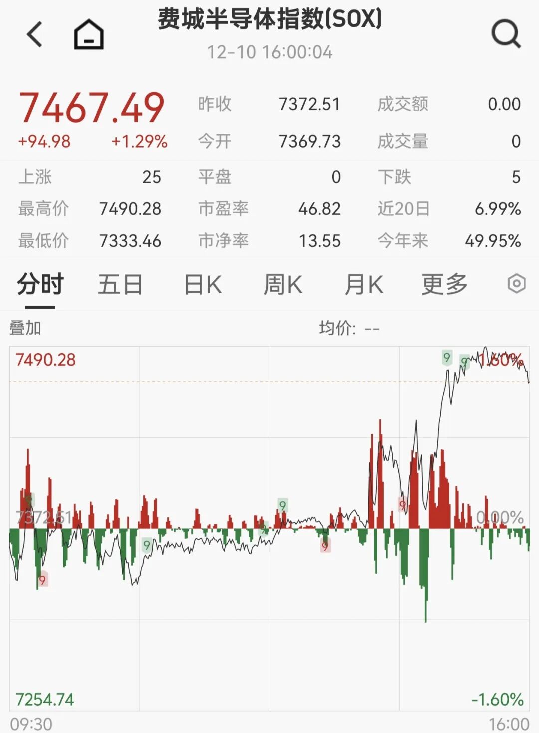 芯片股普遍上涨,费城半导体指数涨1.29%,创历史新高。