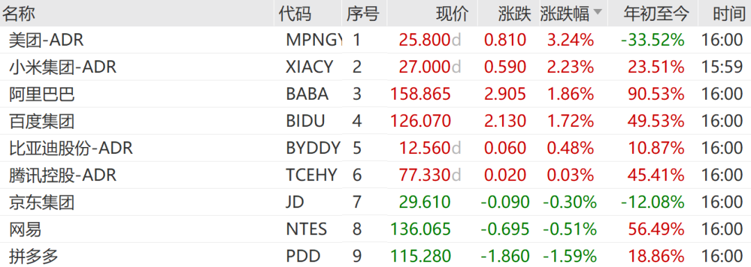 美团涨3.24%,小米集团涨2.23%,阿里巴巴涨1.86%,领涨万得中概科技龙头指数成份股。
