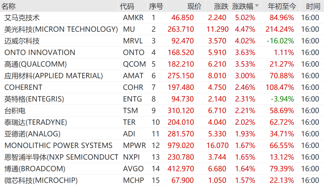 美光科技涨4.47%,迈威尔科技涨4.02%,高通涨3.53%,应用材料涨3.00%。
