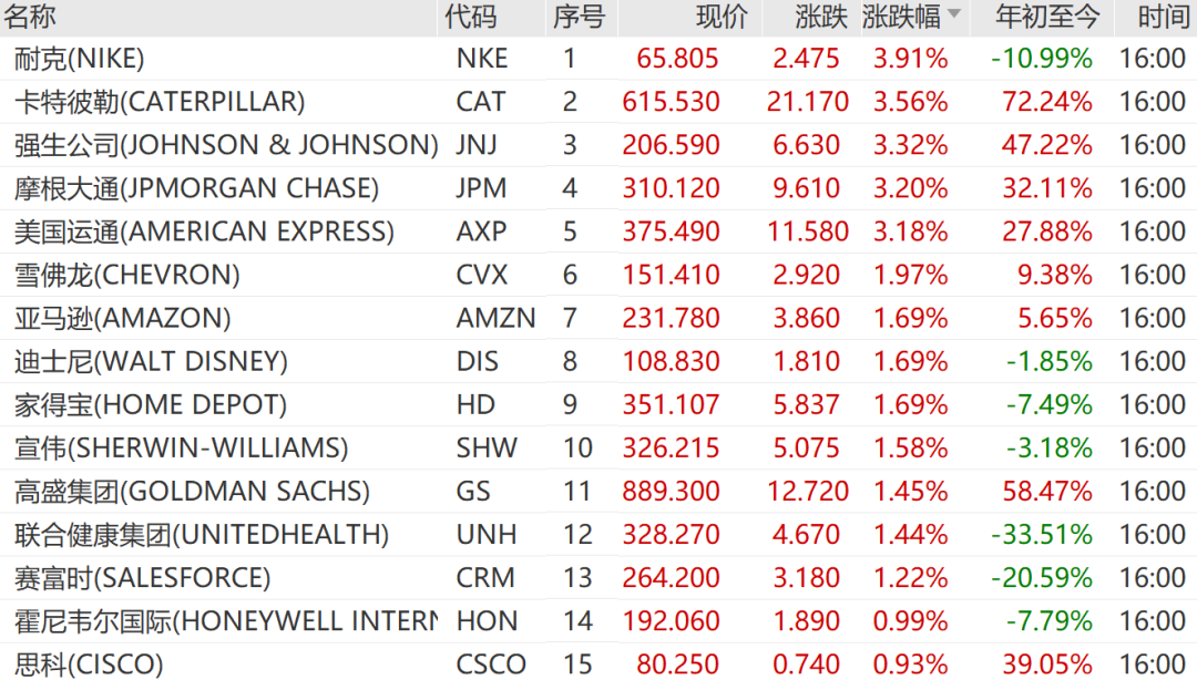 耐克涨3.91%,卡特彼勒涨3.56%,强生公司涨3.32%,领涨道指成份股。