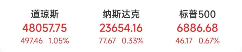 截至当天收盘,道指涨497.46点,涨幅为1.05%,报48057.75点;纳指涨77.67点,涨幅为0.33%,报23654.16点;标普500指数涨46.17点,涨幅为0.67%,报6886.68点。