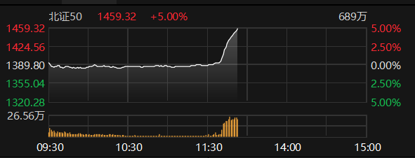 上证报中国证券网讯 12月11日,北证50指数午后拉升,截至13时22分,该指数涨幅扩大至5%。驰诚股份、天力复合涨停。