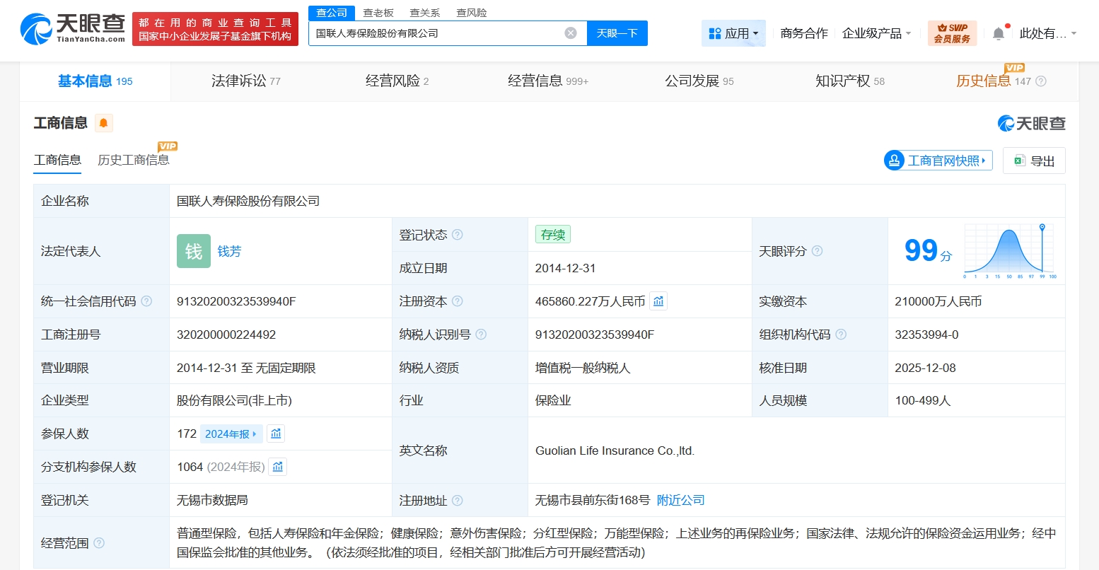 天眼查App显示,近日,国联人寿保险股份有限公司发生工商变更,注册资本由21亿人民币增至约46.6亿人民币,增幅约122%,同时,法定代表人及多位高管发生变更。该公司成立于2014年12月,法定代表人为钱芳,经营范围为人寿保险和年金保险,健康保险,意外伤害保险,分红型保险,万能型保险,上述业务的再保险业务,国家法律、法规允许的保险资金运用业务,经中国保监会批准的其他业务。股东信息显示,该公司由无锡市国联发展(集团)有限公司、无锡灵山文化旅游集团有限公司、无锡市交通产业集团有限公司等共同持股。