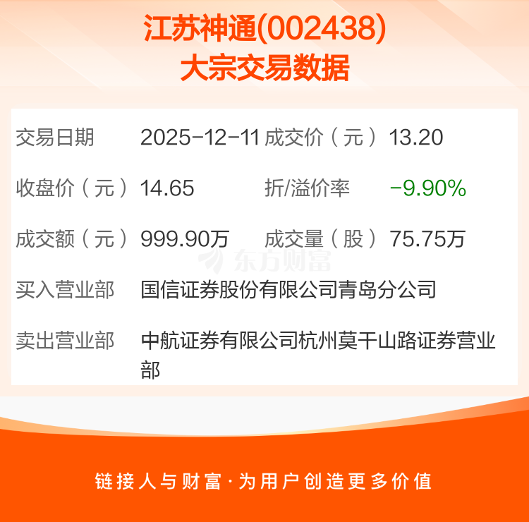 2025年12月11日,江苏神通发生1笔大宗交易,共成交75.75万股,成交金额999.90万元,占其流通市值比例为0.15%。