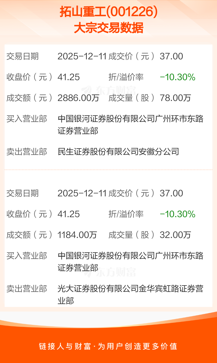 2025年12月11日,拓山重工发生2笔大宗交易,共成交110.00万股,成交金额4070.00万元,占其流通市值比例为2.91%。