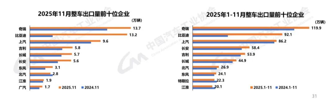 重点企业出口方面,中汽协介绍,整车出口前十企业中,九家企业出口实现正增长。11月,整车出口前十企业中,奇瑞出口量达13.7万辆,同比增长30.3%,占总出口量的18.8%。与2024年同期相比,比亚迪出口增速最为显著,出口达13.2万辆,同比增长3.3倍。2025年1—11月,整车出口前十企业中,奇瑞出口量达119.9万辆,同比增长14.7%,占总出口量的18.9%。与2024年同期相比,比亚迪出口增速最为显著,出口达92.1万辆,同比增长1.5倍。