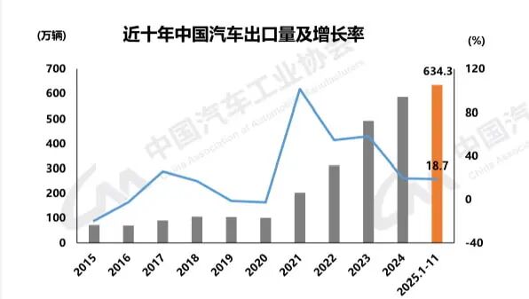 在汽车出口方面,根据中汽协统计,11月,中国汽车出口72.8万辆,环比增长9.3%,同比增长48.5%,本月出口量为历史上首次超过70万辆。2025年1—11月,汽车出口634.3万辆,同比增长18.7%。